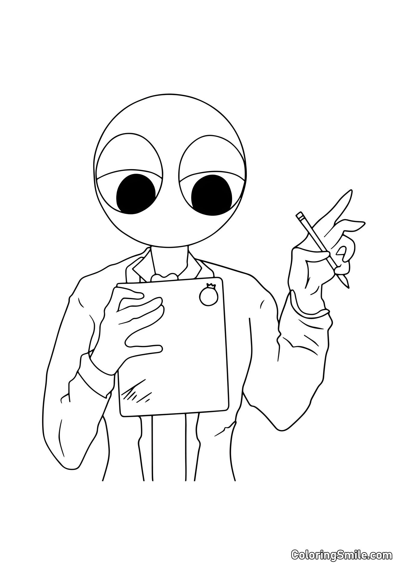- Vermelho: Um personagem excêntrico com uma cabeça grande, vestido com um jaleco branco sobre um terno.